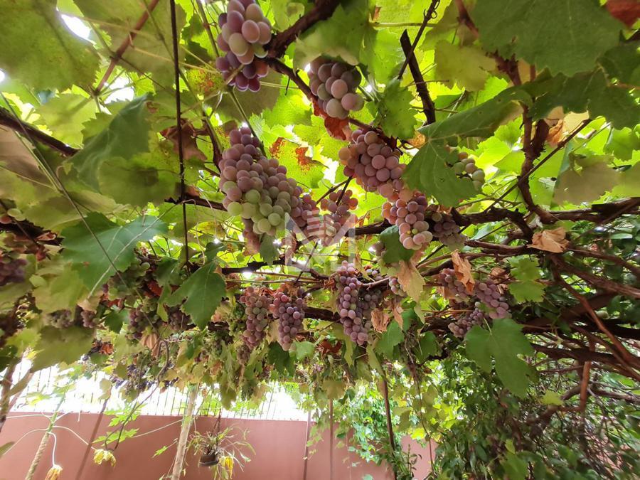 Amplo jardim com muito verde, flores e árvores frutíferas.